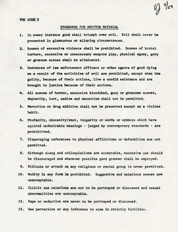 According to the Code, under the heading, “STANDARDS FOR WRITTEN MATERIAL,” it states, “Ridicule or attack of any religious or racial group is never permitted… Nudity in any form is prohibited. Suggestive and salacious scenes are unacceptable… Illicit sex relations are not to be portrayed or discussed and sexual abnormalities are unacceptable… Rape or seduction are never to be portrayed or discussed… Sex perversion or any inference to same is strictly forbidden.”